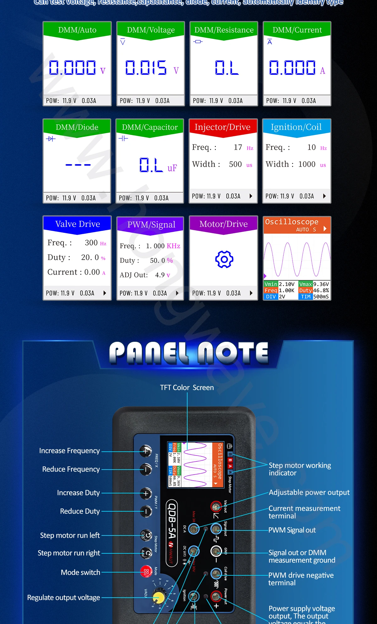 The QDB-5A Automobile Actuator Drive Detector offers a range of diagnostic functions for automotive maintenance, including oscilloscope, PWM drive output, stepper motor drive, signal simulation, ignition testing, and multimeter capabilities. These functions support testing and identifying issues in various vehicle components (note: only supports some models, to be identified by the user). Below is a detailed list of the main functions, categorized by type: